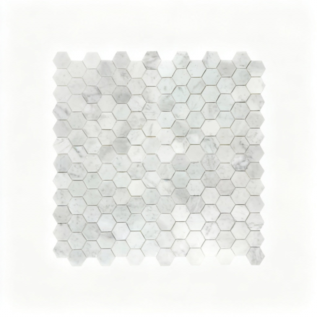 The neutral white palette with delicate gray veining complements wood, metallic accents, natural stone, and neutral color schemes, making it a versatile choice for any high-end interior. Whether used as a statement wall, elegant backsplash, or sophisticated flooring accent, the Regalia Elite Carrara White Polished Hexagon Marble Mosaic delivers premium quality, timeless beauty, and refined luxury.